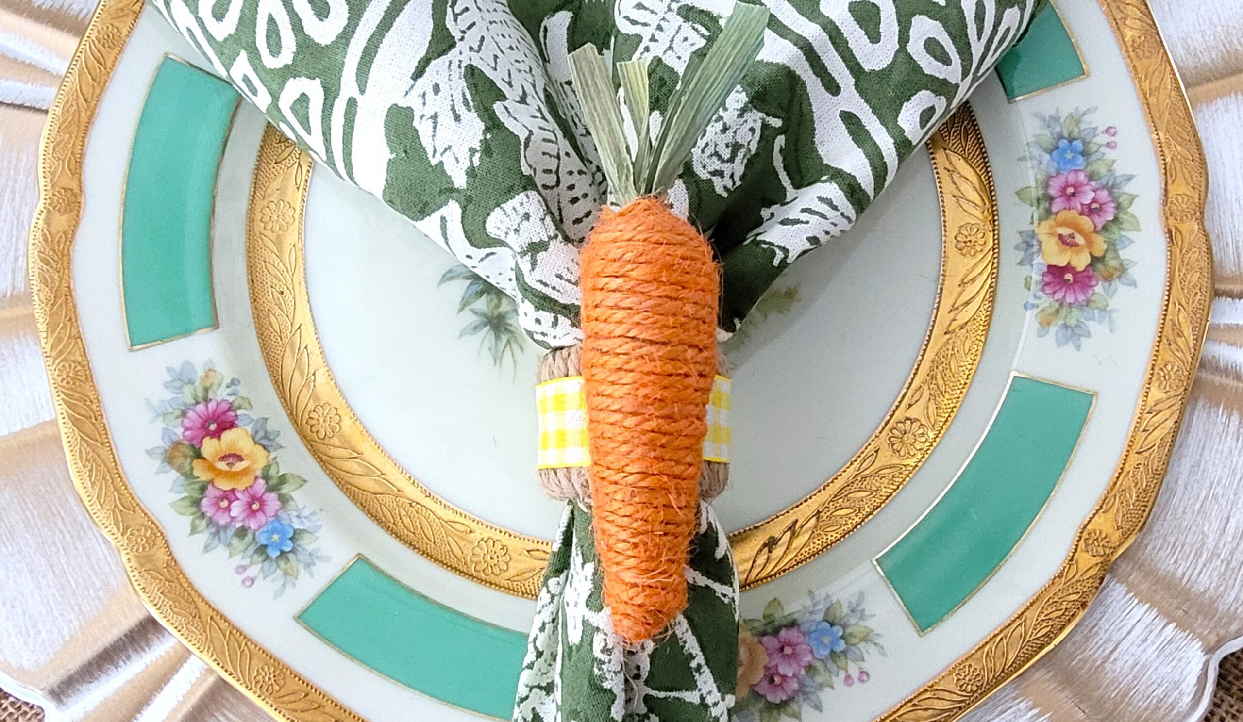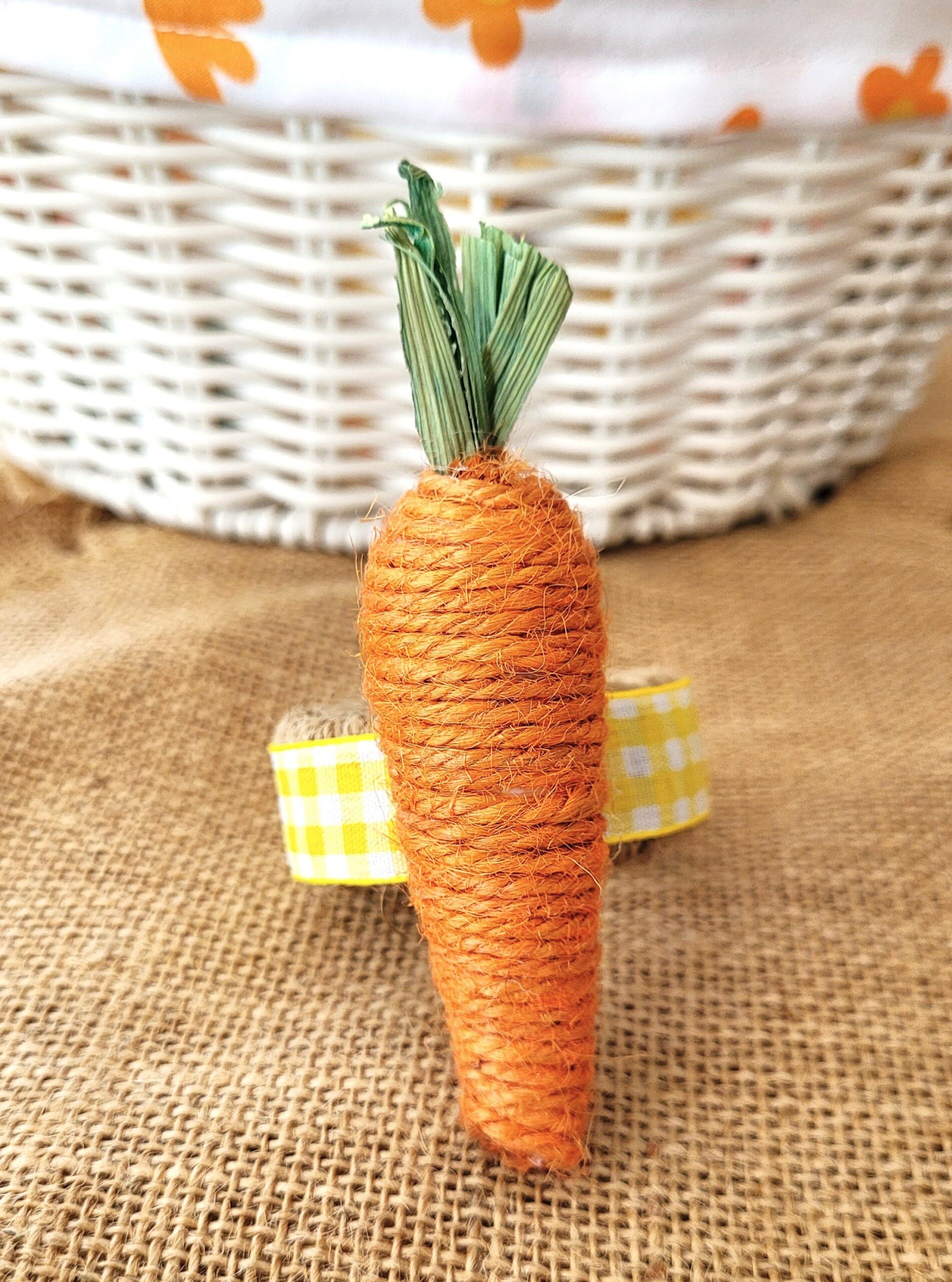 At this point, you may opt to add some ribbon before attaching the carrot. This offers a bit more color and interest. To do this, cut a piece of ribbon to wrap around your napkin ring and secure the ends with some hot glue.